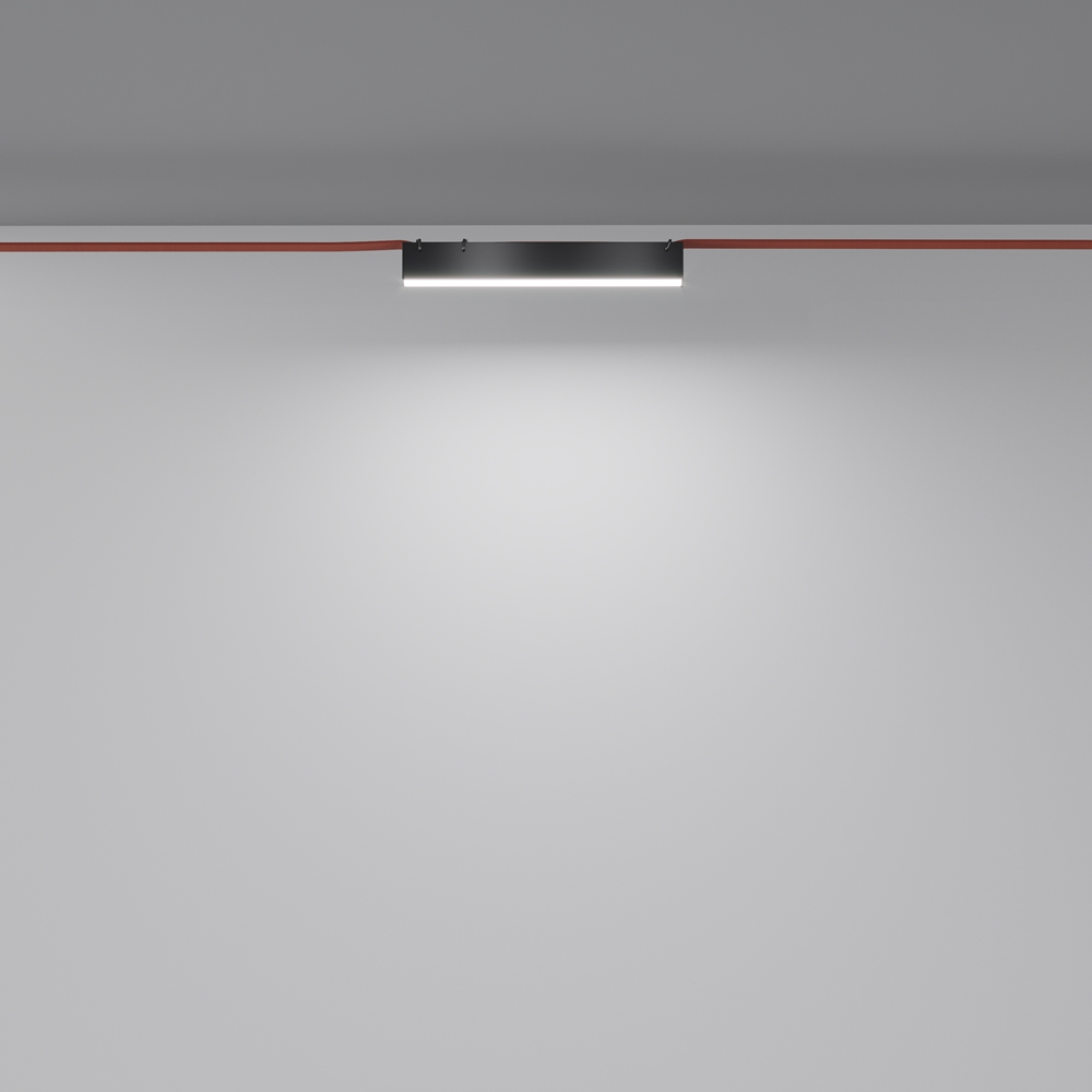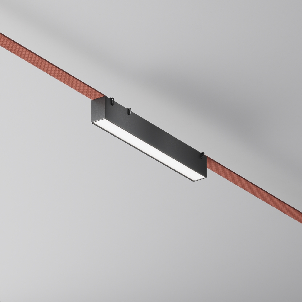 Корпус светильника выполнен из экструдированного алюминия — лёгкого и прочного материала, устойчивого к деформациям и перегреву. Стильный черный корпус с чёткой геометрией и компактными размерами около 323×40×45 мм аккуратно смотрится на текстильной шине и вписывается в минималистичные интерьеры. Матовый поликарбонатный рассеиватель формирует ровную световую линию без бликов и пересветов, а сама серия Basis доступна в чёрном и белом цвете, с разными размерами и мощностью для гибкого дизайна освещения в рамках текстильной системы Parity.