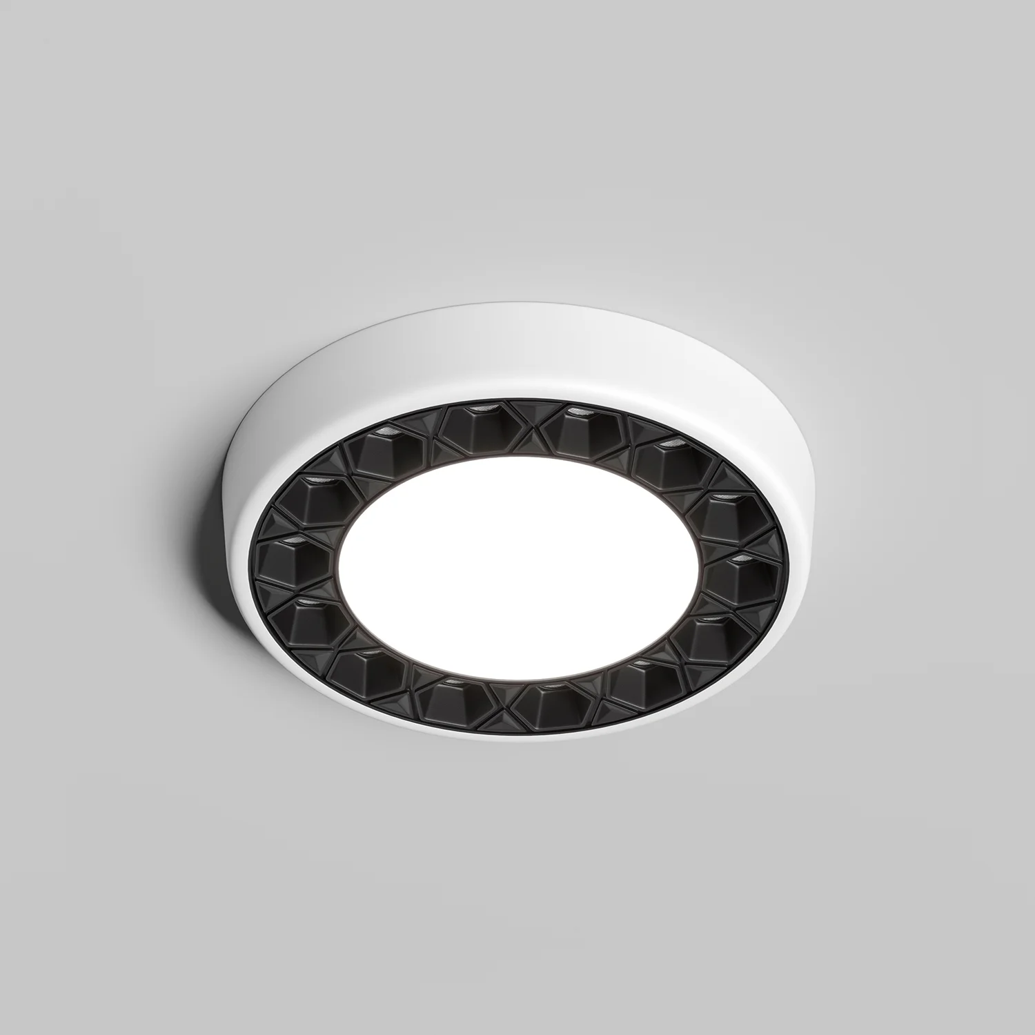 Светильник излучает дневной белый свет 4000K, который остаётся нейтральным и не искажает оттенки отделки и мебели. Центральная матовая часть даёт мягкий комфортный свет, а периферийная зона в «сотах» добавляет акцент и лёгкий декоративный эффект. Корпус выполнен из алюминия и акрила, что обеспечивает лёгкость, достаточную жёсткость и аккуратный внешний вид. Диаметр светильника — 120 мм, высота всего 21 мм, поэтому он смотрится аккуратно и практически заподлицо с потолком.