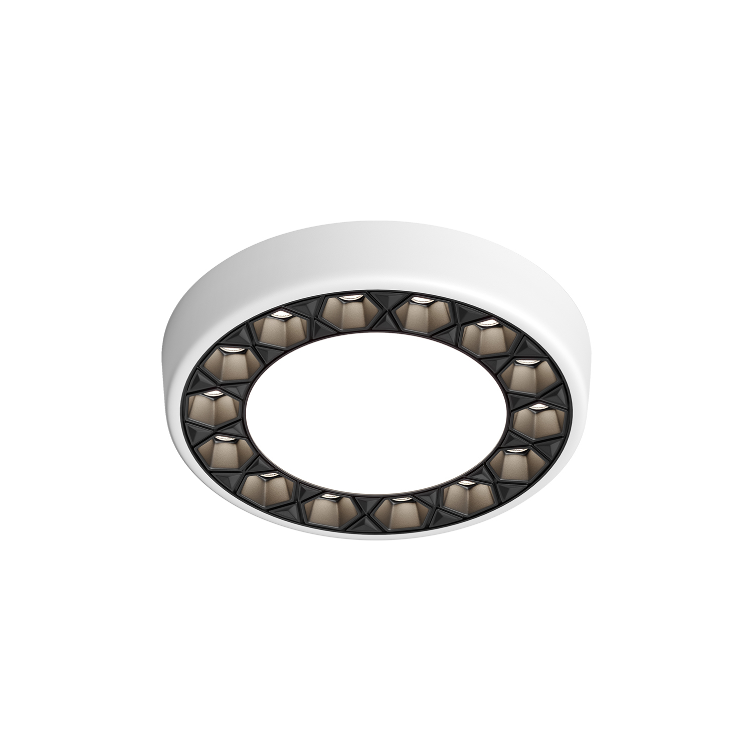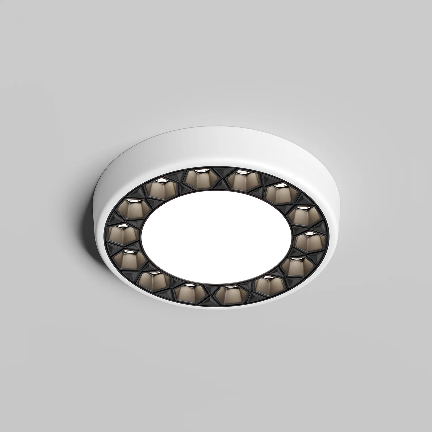 Цвет исполнения белый/чёрный позволяет вписать светильник и в светлые минималистичные потолки, и в контрастные дизайнерские решения: белый внешний контур визуально облегчает форму, а чёрные элементы внутри добавляют глубину и аккуратный графичный акцент.
