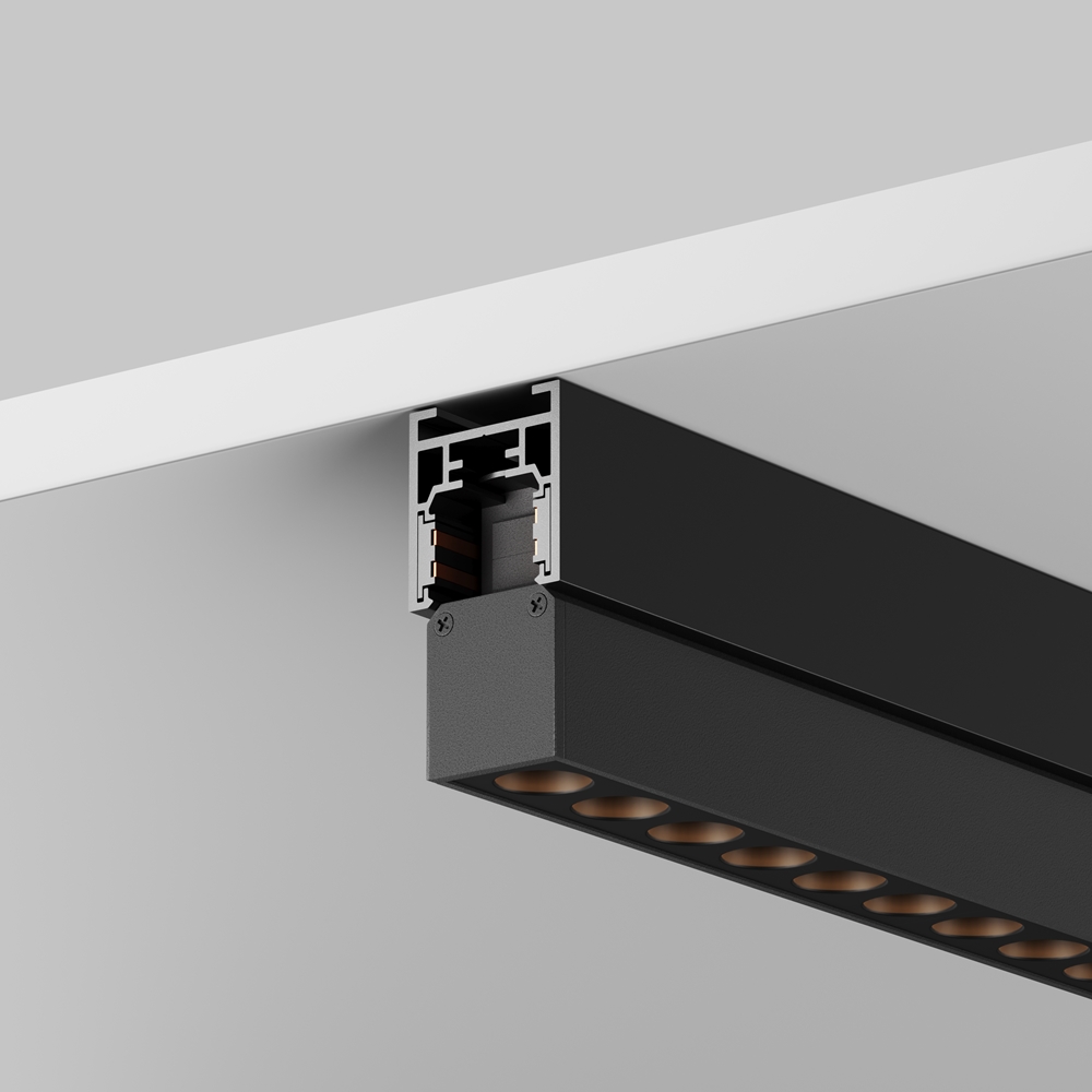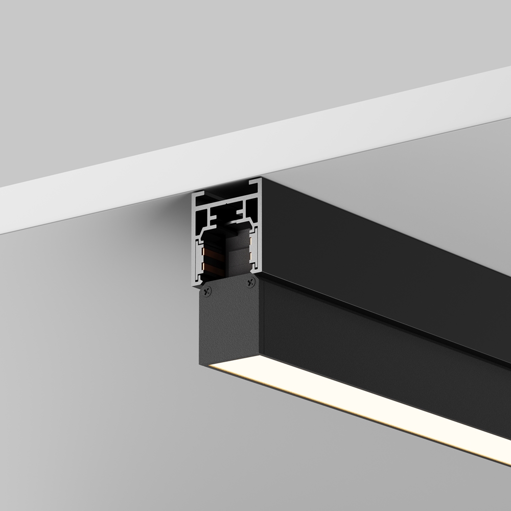 Корпус выполнен из алюминия, что обеспечивает жесткость и стабильность геометрии на протяжении всего срока службы. Материал устойчив к деформациям, не боится регулярного обслуживания светильников и снятия/установки модулей. Матовая черная отделка органично смотрится в современных интерьерах: от минимализма и лофта до коммерческих пространств с темным потолком.