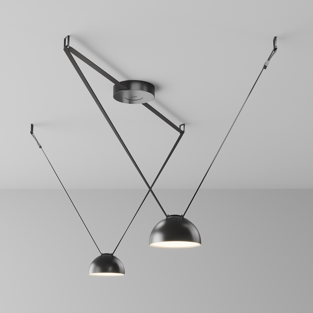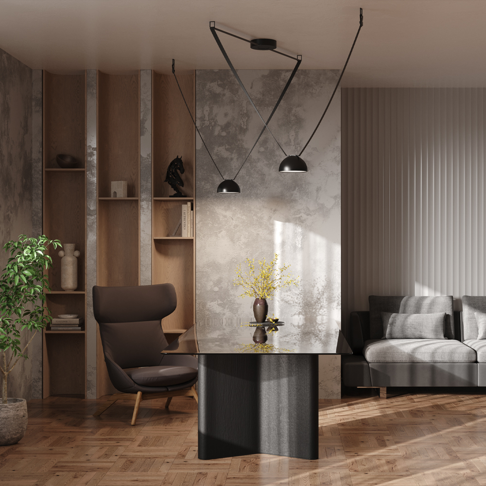 В результате вы получаете две яркие подвесные точки тёплого света 3000K на графитовой текстильной шине длиной 5 м — готовую световую сцену для стола, барной стойки или рабочей зоны.