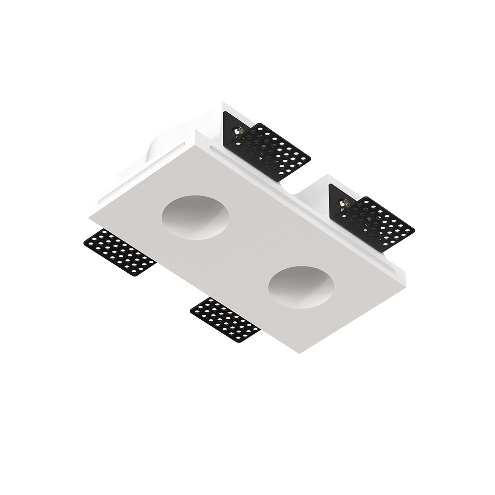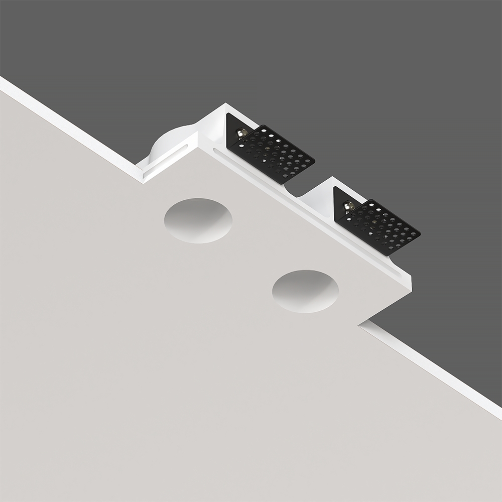 Stellanova QUASAR 40 DUO — это встраиваемый гипсовый светильник с двумя независимыми световыми зонами, ориентированный на аккуратную архитектурную подсветку и современный минималистичный дизайн. Корпус полностью интегрируется в потолок из гипсокартона, а после шпаклёвки и окраски светильник визуально становится частью плоскости, остаются только два чистых круглых отверстия под световое пятно Ø40 мм. Такое решение выглядит значительно дороже классических «точек» и идеально подходит для интерьеров, где важна чистая геометрия и отсутствие визуального шума.