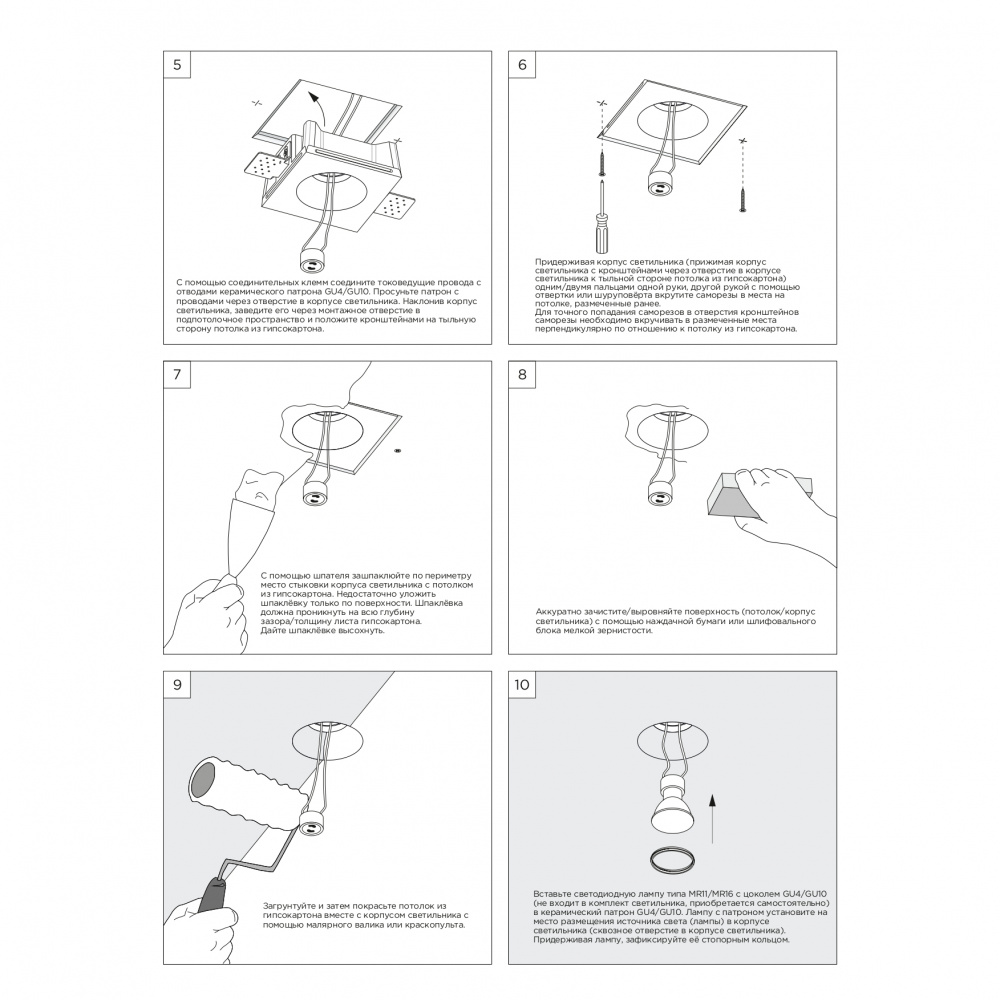 Масса светильника составляет 0,75 кг — это комфортный вес для монтажа в потолок из ГКЛ при соблюдении стандартных требований к каркасу и подвесам. В комплект поставки входит всё необходимое: гипсовый корпус, монтажные кронштейны, установочные винты, керамические патроны GU4 (2 шт.), соединительные клеммы, стопорные кольца, защитные заглушки и руководство по монтажу. Это сокращает время на подбор фурнитуры и позволяет сразу переходить к установке.