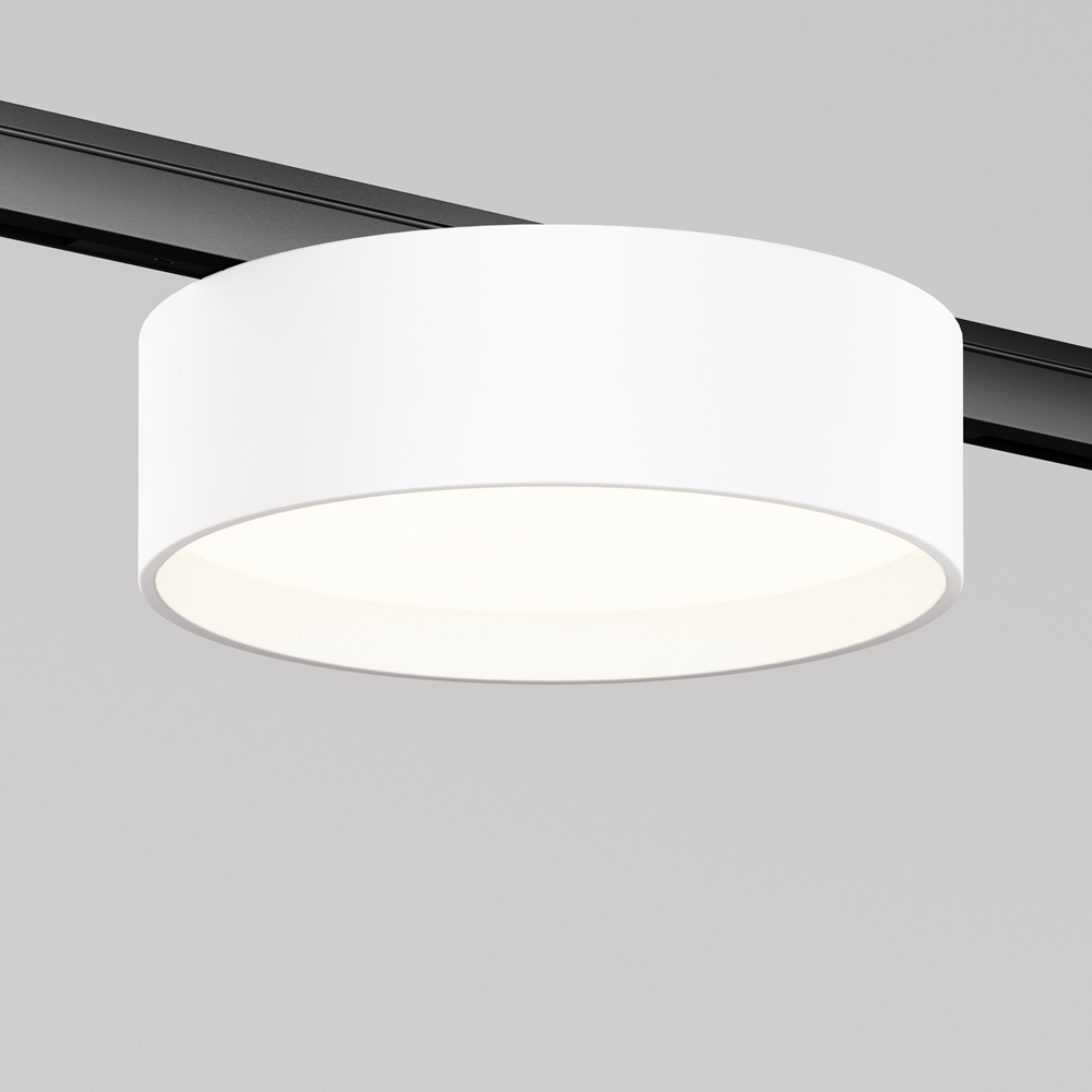 Корпус выполнен из алюминия в белом цвете, арматура — чёрная. Белый корпус визуально облегчает потолок и хорошо смотрится на светлых основаниях, а чёрная арматура поддерживает графику трековой системы. При высоте всего 34 мм и диаметре 113 мм светильник остаётся компактным, а плоская форма уменьшает визуальный шум — это важно, когда в проекте много линий света и хочется сохранить чистую архитектуру потолка.